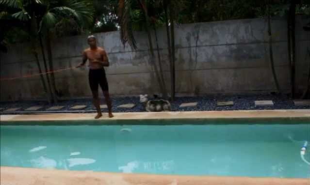 不尋常的東西,, 一隻貓喜歡在游泳池游泳的人.