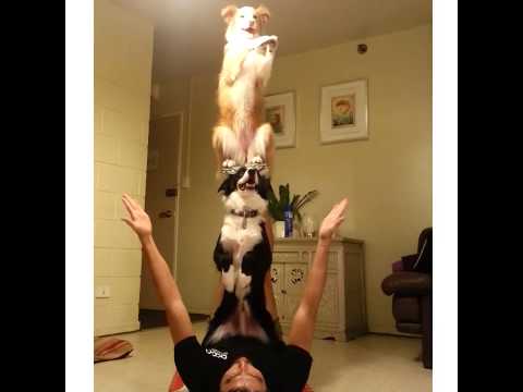 邊境牧羊犬 Ace (黑色和白色, 22月齡) 和霍莉 (紅色和白色, 28月齡) 炫耀令人難以置信的平衡技巧與他們的主人. 你能相信嗎?