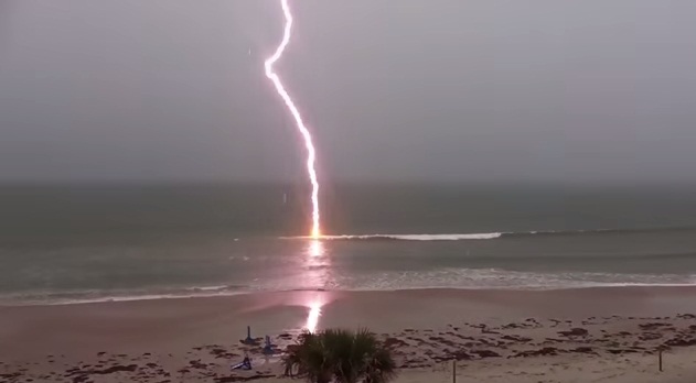 偉大的閃電擊中在代托納海灘,佛羅里達州海的時刻 (美國). 慢動作鏡頭是壯觀.