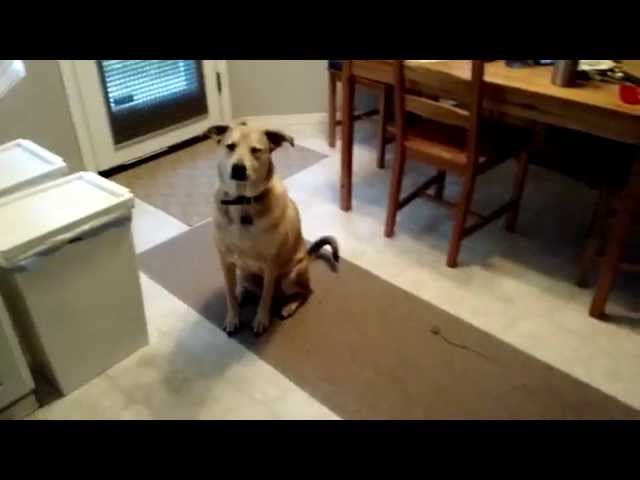 印第安那狗獲取太興奮的當他看到他的老闆打開櫃櫥與食物, 但試圖包含,在吃之前坐謹慎.