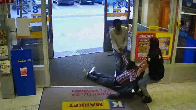 在芬蘭的超市員工灑用胡椒噴霧劑試圖打破一個小偷和把他拉回了商店. 女人拒絕讓兩名男子離開後他們先前曾試圖竊取一些啤酒罐. 這一事件發生幾天前在赫爾辛基,芬蘭.