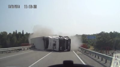 在俄羅斯的汽車儀錶盤攝像機捕獲的時刻,持久性有機污染物的運載蔬菜拖車輪胎和司機失去控制的車輛. 幸運的是沒有人受傷. 領航員在車裡用相機, katatromagmeni 的叫喊聲: 「我求你了, 氣孔. 凱恩的背, 返回, 返回, 回來…哦, 媽媽咪呀!”.