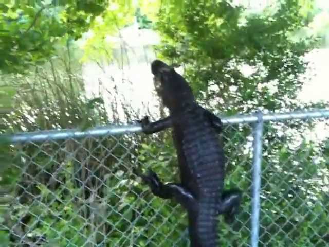野生動物在美國佛羅里達州的大沼澤地國家公園, 一個人寫的鱷魚爬上高高的籬笆達到水.