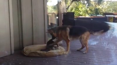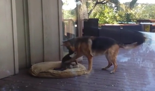 一隻德國牧羊犬站在一隻貓和她剛出生的小貓身上, 檢查一切是否正常.