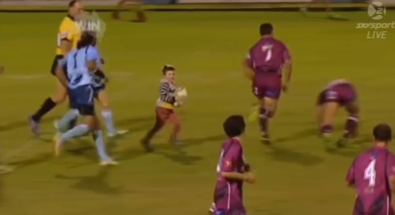 星期六,2015年8月1日,在澳大利亞昆士和新南威爾士州的精英之間的橄欖球比賽中, 一個男孩4歲進入這個領域後成功越獄母親的監督. 玩 pitsiriko, 兩支球隊的球員給他球,讓他踢進一球.