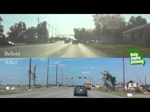 2011 年 5 月 22 日龍捲風襲擊美國喬普林之前和之後在完全相同的路徑上拍攝的視頻