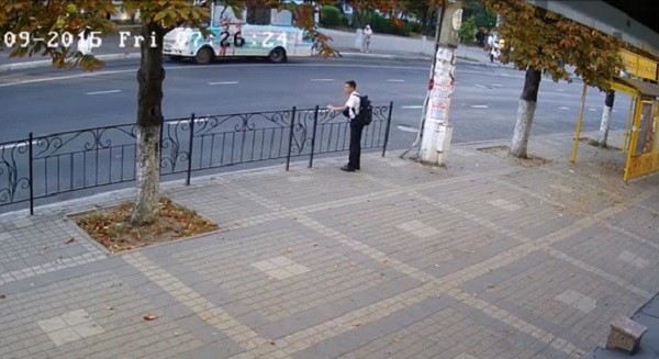 小瞳孔在辛菲羅波爾烏克蘭冷靜地為偶然幾秒鐘, 當一輛車落在欄杆上,在那裡站了幾秒鐘前.