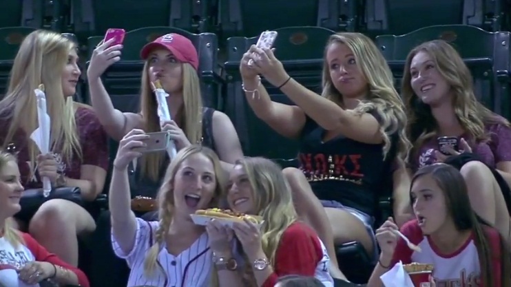拍照和微博之間, 女孩沒有太多的時間致力於作為觀眾的遊戲. 看到新一代的「悲傷」景象, 解說員會開玩笑建議沒收手機直到比賽結束…