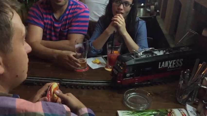 他們曾在酒吧裡 Vytopna 啤酒的方法, 在布拉格,捷克共和國, 非常值得注意的是. 小鐵路路軌位於每個表, 過山車到達與在客戶面前的啤酒.
