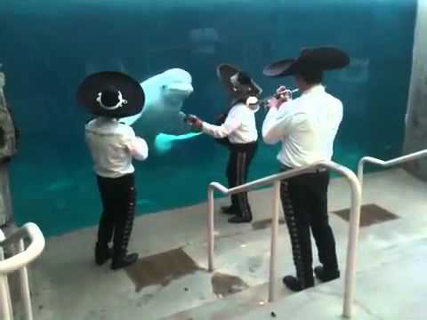 在康涅狄格州神秘水族館鎮, 一隻白鯨逗樂逗小孩. 她走近窗戶,用...