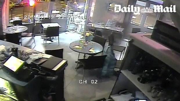 英國報紙每日郵報發表從監控攝像機的視頻在 Cosa Nostra 餐廳在巴黎, 在這場血腥襲擊恐怖分子的目標之一.