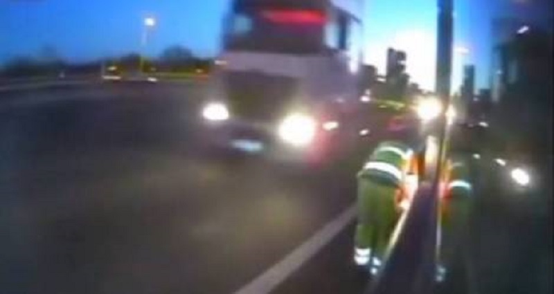 一位在英國的 M25 高速公路邊上停止了他的卡車司機, 奇跡般地避免死亡. 那人停了下來下, 了他的卡車,檢查輪胎, 儘管他穿訂明反光背心, 另一輛卡車的司機沒有不被注意,儘管小誘惑.