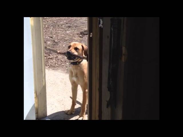 一隻狗和很長的棍子,在嘴裡, 試圖通過房子的門.