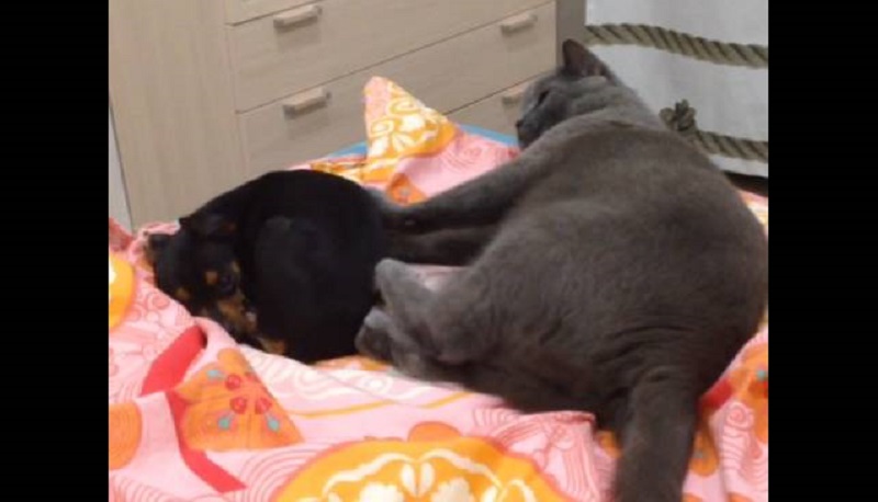 不需要的狗侵入貓的私人空間. 他們好像不是很喜歡對方…