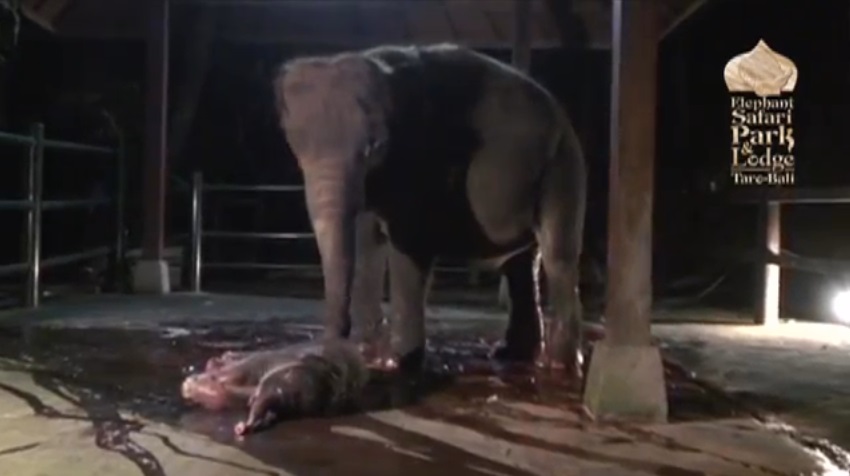 芋頭公園巴厘島, 一隻雌象奠定了它的小. 雖然最初大象貌似靜止不動, 沒有呼吸. 但他的母親知道怎樣做才能恢復.