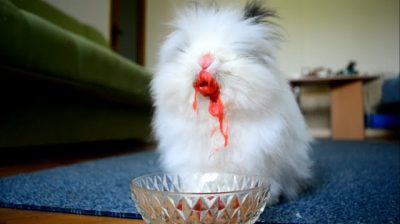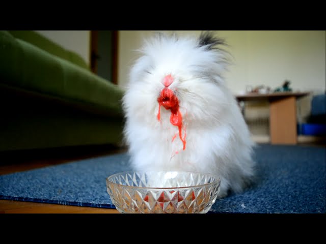 健壯, 可愛的白色毛兔吃草莓和櫻桃. 紅嘴使他看起來像吸血鬼的兔子!
