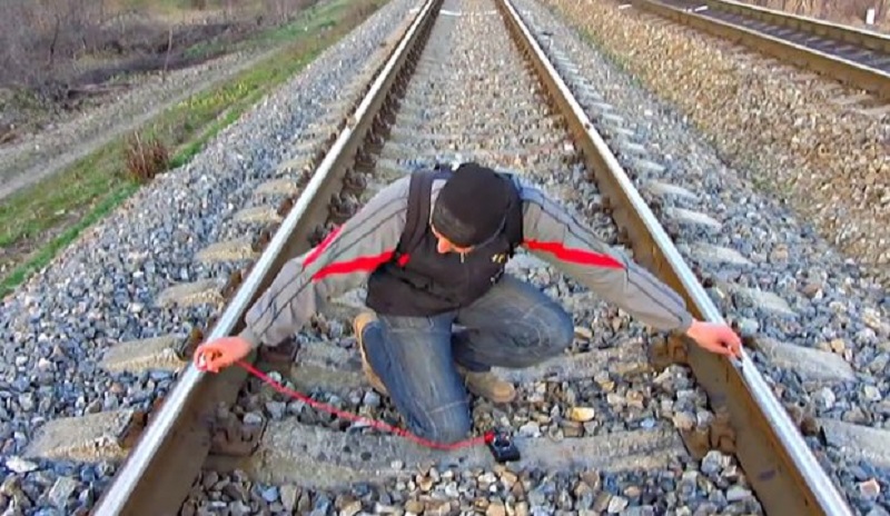 一個年輕男子從俄羅斯解釋是相當危險的技術,為手機電池充電, 與電流流經軌道的一條鐵路線.