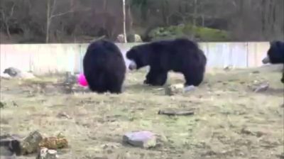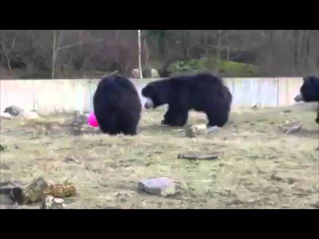 一個有趣的場景, 在三隻小熊的探索野生的氣球, 在荷蘭的野生動物公園 Beekse 貝根.