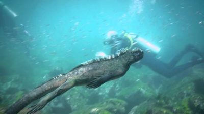 海鬣蜥 (鯰魚- Amblyrrygchos 冠) 這是非常罕見的僅在加拉巴哥群島上發現了鬣蜥和所具有的能力, 獨一無二的現代蜥蜴, 它生活和飼料在海面上, 正因此,海洋爬行動物. 它可以潛入水中超過10米. 它主要在多岩石的海岸島嶼上生活, 但可以檢測到並在沼澤或濃密的海灘.