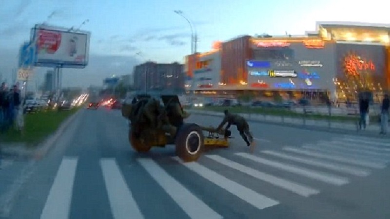移動在俄羅斯新西伯利亞市的一條街道的軍用卡車組成的車隊, 牽引火炮榴彈炮加農炮. 突然, 加農炮之一解決被一輛卡車和失去了控制在大道. 相當多的努力後, 一名士兵與一名行人無法停止.