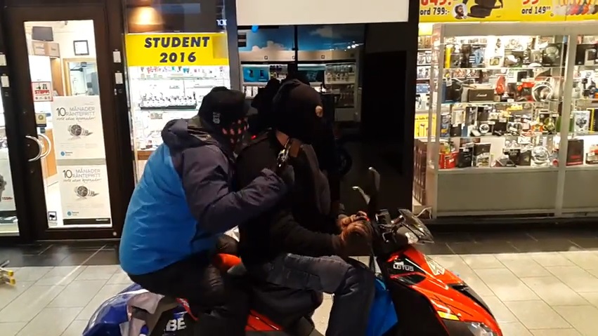 上週五,2016年5月13日10:30日上午在商場西斯塔Galleria購物中心 (斯德哥爾摩郊區, 瑞典), 兩個蒙面的男子試圖搶劫一家珠寶店的摩托車與.