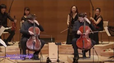 2Cellos (盧卡 Sulic 和斯捷潘 · 豪瑟) 執行適應在他們一塊光滑的刑事邁克爾 · 傑克遜, 2015 年 7 月在東京三得利音樂廳舉行的一場音樂會上.