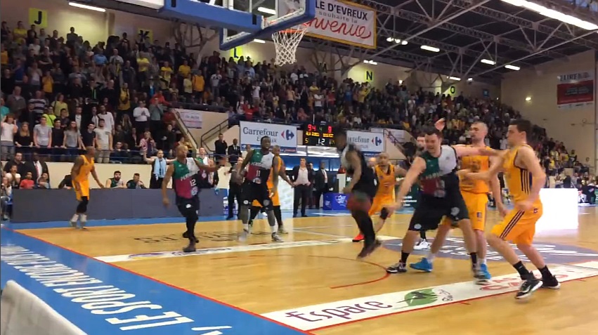 法國集團諾巴斯蒂 ALM Évreux, (第二類), 他實現了這個令人難以置信的籃子裡,在籃板後方在結束了這場比賽, 發送比賽進入加時賽. 在加班, 他的球隊以 114-107 取勝.