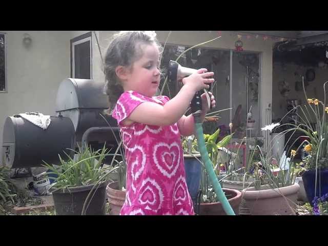 在花園裡, 一個小女孩充滿水軟管噴壺. 然後我試圖從手動噴嘴直接喝水. 奶奶解釋說,這不是一個好主意, 但小是很好奇,想試試.