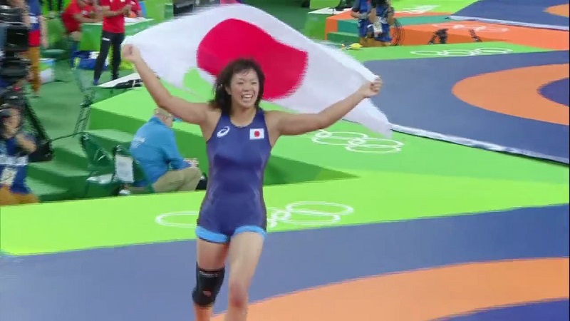 2016 年 8 月 18 日,星期四,里約奧運會, 日本摔跤手河合里沙子獲得63公斤級金牌並搞笑感謝教練. 然後巡遊與教練的肩膀.