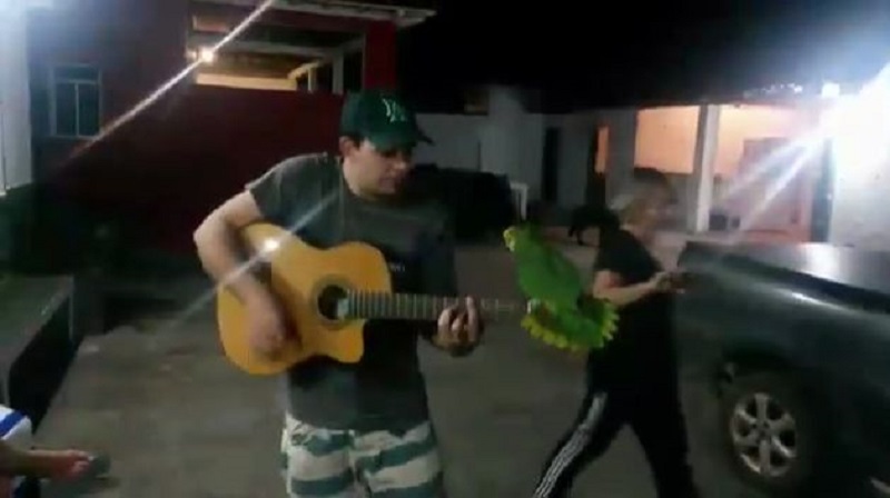 在巴西, 吉他手和一隻鸚鵡唱二重唱. 鸚鵡坐在扶手上的吉他, 伴隨著吉他手吹口哨和唱歌.