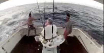 大馬林魚跳躍速度在船尾的一艘漁船上, 和漁夫跳躍嚇壞了落水來挽救他的生命.