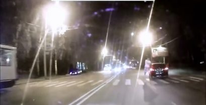 一名行人偶然保存最後一刻, 當它試圖向飛快地穿過這條路. 一輛車,用極快的速度移動躲避他的只是幾釐米.