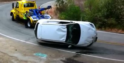 起重機操作員試圖恢復已被推翻的汽車, 但事情並不太順利.