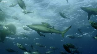 由於沙丁魚的大群夏季遷移, 多個獵物的周圍的濃縮. 密封件, 海鳥, 海豚, 噸, 鯊魚和鯨魚, 所有急於搶美味的食物. 水下, [...]