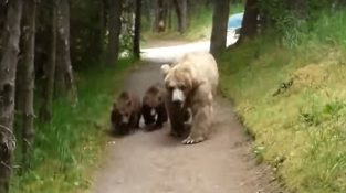 杰弗裡格拉斯納在沒有卡特邁國家公園徒步旅行, 美國國家公園西南阿拉斯加, 當由灰熊和兩個幼崽在面臨路徑. 熊家族 [...]