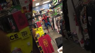 在巴西店, 一名身穿蜘蛛人服裝的男子隨著 A-Ha 的“Take on me”的節奏做出令人難以置信的舞蹈動作.