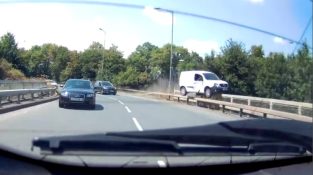 在英國伯明翰高速公路A38, 一輛麵包車爬升和在安全屏障移動數米, 盡量避免其它車輛左急轉.