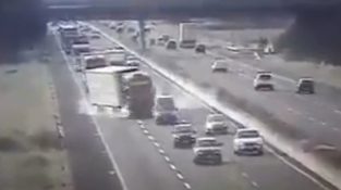 在皮亞琴察,意大利街頭, 卡車的前輪胎會爆炸,車輛將翻倒掉落到分隔帶.