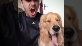 金毛尋回犬在鏡頭前模仿他的老闆.