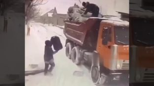 當駕駛員從其推翻的水桶中清空土壤時,卡車被推翻. 然後駕駛員從他的機艙發射出來,猛烈地降落在地面上.