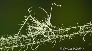 令人印象深刻的偽裝蝗蟲 (馬奇亞海斯特里克斯) 沿著樹枝慢慢走 (哥斯大黎加).
