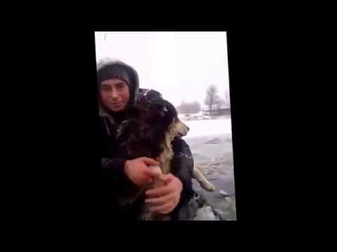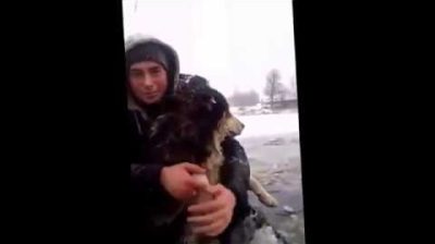 Ust-Dolyssy 村的道路工人 (涅韦尔斯基区) 从冰冷的水中拉出一只狗.