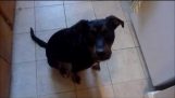 一个小的狗想吃比萨饼, 但片卡在上颚的牙齿. 然后是...