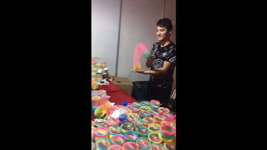 在中国一个人卖塑料弹簧-游戏 (紧身), 使令人印象深刻的展现在他的客户面前.