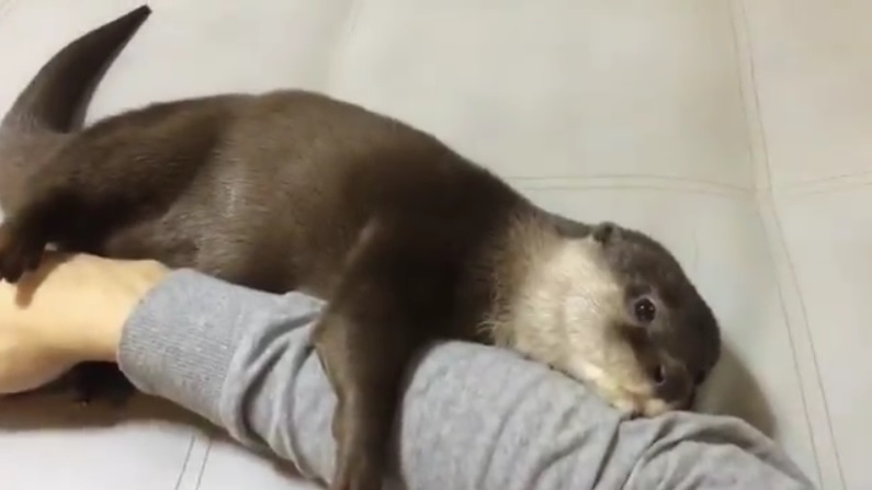 一个可爱的水獭拥抱一个男人的手, 问一些可爱.