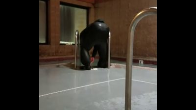 一个人刚出来一池, 试图清空穿着被困在潜水衣的水.
