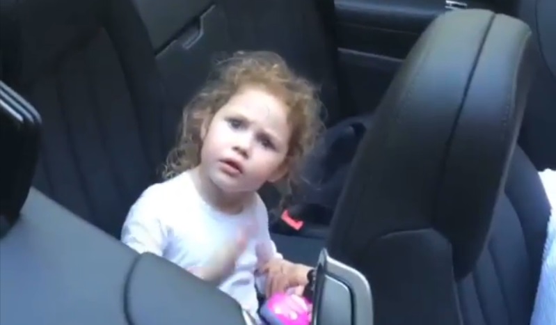 一位大叔惊吓的小侄女坐在敞篷的背, 关闭的自动车顶. 可以听到她旁边的父亲大喊“她要吃了你”!”.