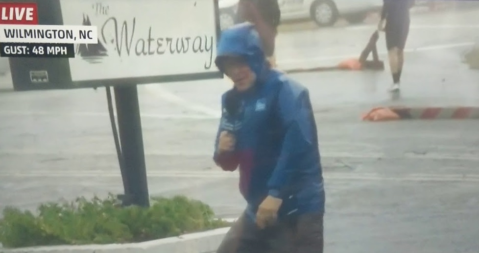 记者假装飓风佛罗伦萨的强风斗
