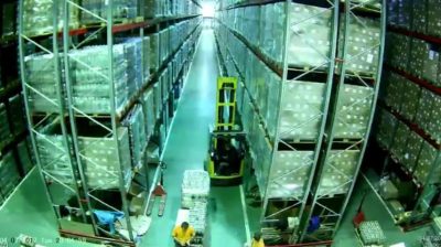 叉车司机会撞到机器上的一个大仓库的货架, 引起连锁反应,将推倒几乎所有的货架.