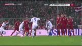 一个人做一个令人印象深刻的精度用弓射, 随后的两个塑料瓶动从字符串挂. 这...